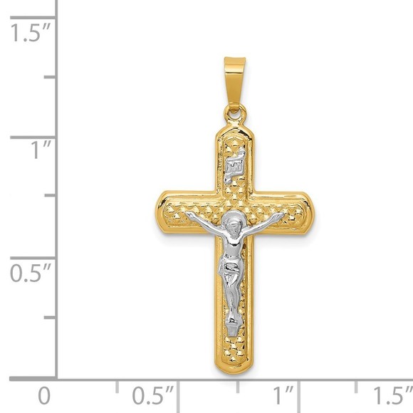 Million Charms 14k Gold Two-tone Polished and Textured INRI Crucifix Necklace Charm Pendant 1 grams. Fine Jewelry, Pendants and Charms, Themed Charms, Religious Charms, Crucifix Pendants, INRI CrucifixPurity: 14K, Finish: Polished & Brushed, Length of Item: 32 mm, Charm/Element Length: 28.5 mm, Charm/Element Width: 17 mm, Feature: Hollow, Manufacturing Process: Die Struck, Material:Primary: Gold, Item Weight U/M: gm, Width of Item: 17 mm, Texture: Textured, Bail Width: 2.3 mm, Color: Two-Tone, Bail Length: 5.5 mm Made in UNITED STATES