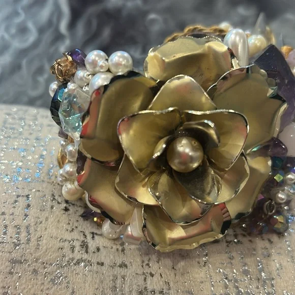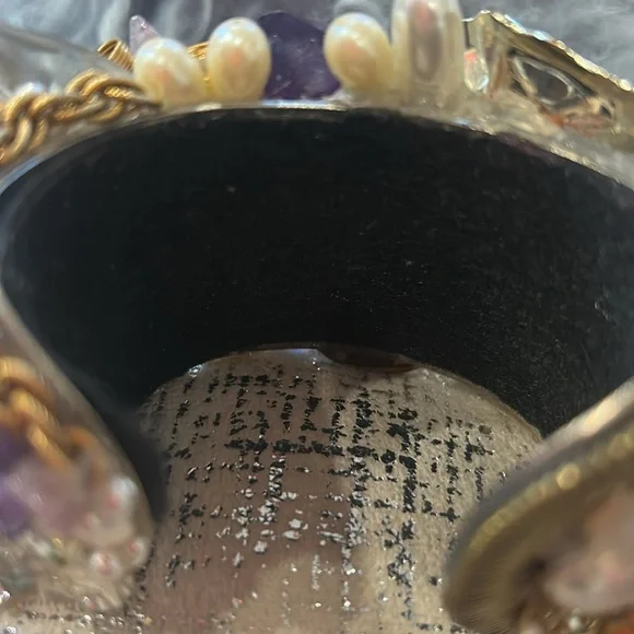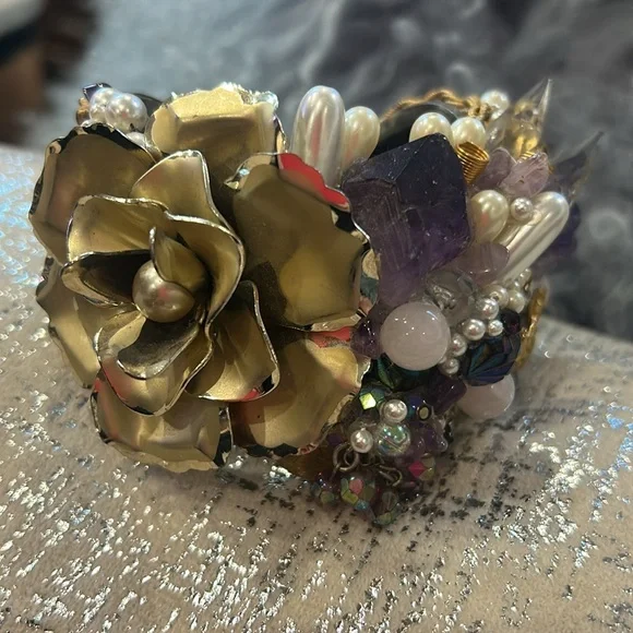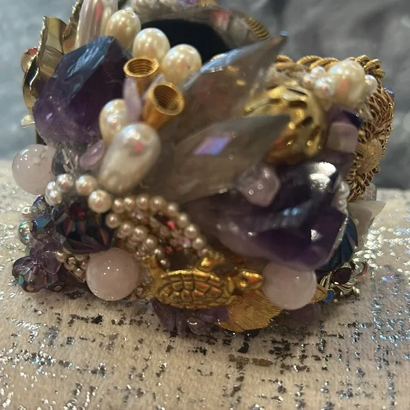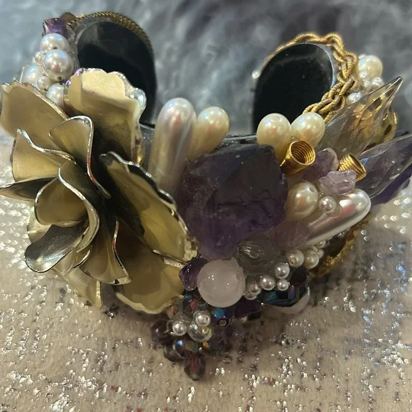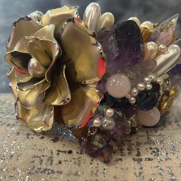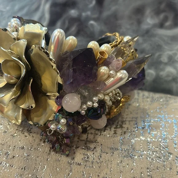 This was an amazing designer statement cuff we used as a display piece in our gallery’s showcase. It features lots of raw Amethyst, Quartz, Rose Quartz, faux pearls, vintage...