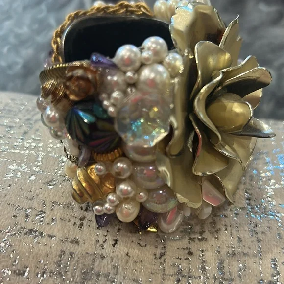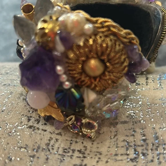 This was an amazing designer statement cuff we used as a display piece in our gallery’s showcase. It features lots of raw Amethyst, Quartz, Rose Quartz, faux pearls, vintage metal findings and Aurora Borealis crystals. Some beads and charms dangle and have playful movement. It is a custom designed one-of-kind statement art cuff. It has a metal base and handmade felt lined for added grip and comfort. This is “wearable art” and has weight. It looks like Wendy Gell but it could very well be a design by Ungapotchka Gallery, an amazing NY studio in the ‘80s-‘90s. It will fit a 6.5-7” wrist not for a thicker wrist probably because it is not adjustable. I believe squeezing or pulling open might compromise cuff. Such rare unique treasure from the age of bold accessories. Bubble wrapped in ZRM Sorrelli inventory