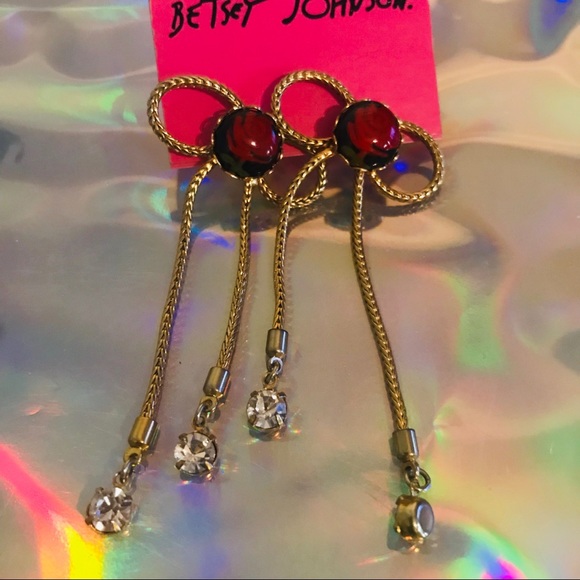 Gold bow dangle long earrings vintage lucite red rose earrings by Betsey Johnson