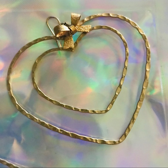Gold colored heart shape dangle bow earrings by Betsey Johnson vintage double hoop retro dollbaby pinup girl 90’s babe