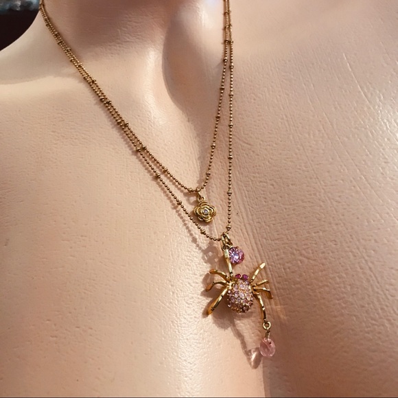 Betsey Johnson gold pink crystal spider charm heart rose pinup goth necklace B8
