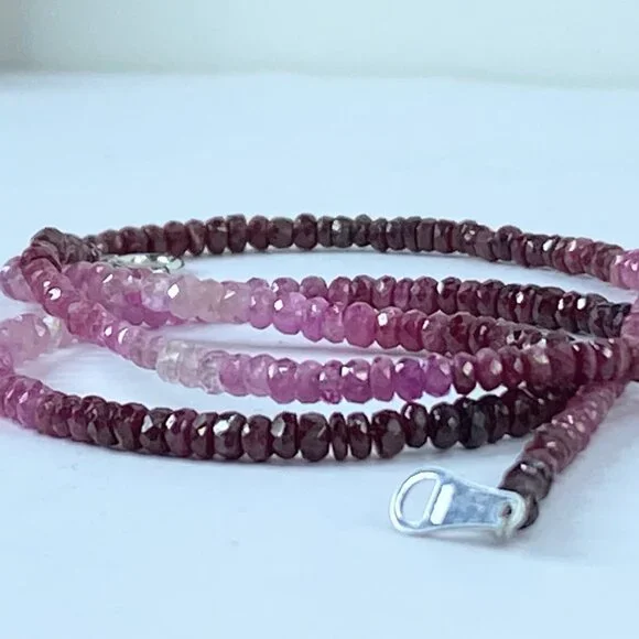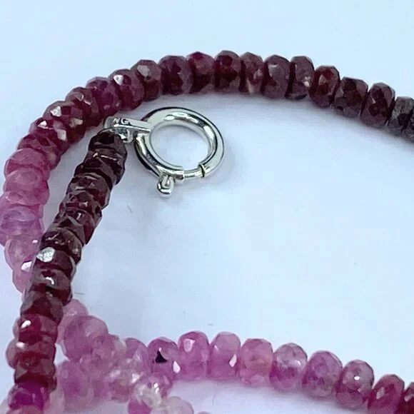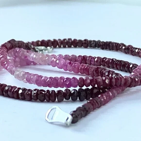 Natural Ruby Gemstone Beads,July Birthstone, graduated color. Natural, untreated, shaded ruby rondelle faceted, AA grade, originating from Africa—size: 2.6mm - 3.14mm (LxW) and approximately 0.26 carats—Hand-strung in wire, 18K (750) clasp.