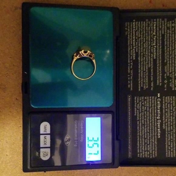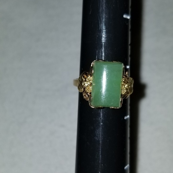 Very nice vintage green jade ring with flowers on each side. Please see all pictures. It is stamped 10k. Condition is good, may need some cleaning... The ring has light...