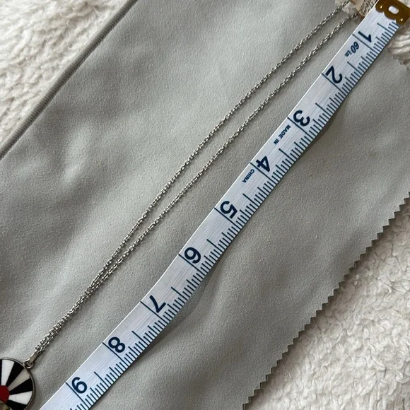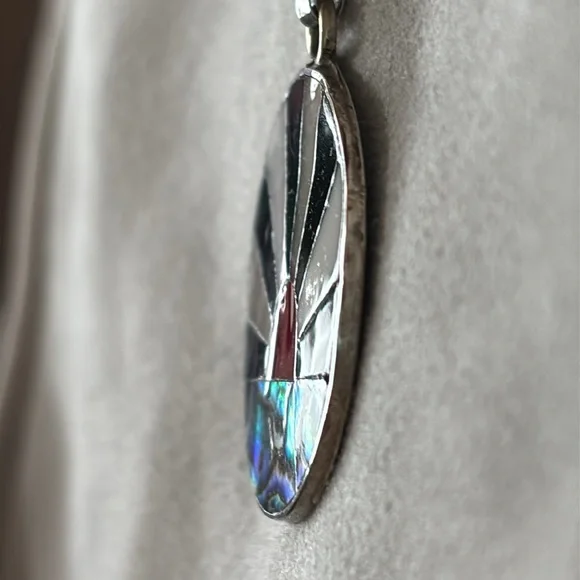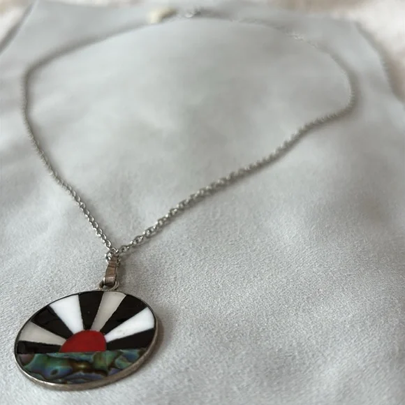 This is a Zuni necklace featuring a "sunface" design, which is a traditional motif in Zuni jewelry. Zuni jewelry is handcrafted by Zuni Native American artisans, primarily from the Zuni Pueblo in New Mexico. The sunface symbol often represents life and energy within several Native American traditions. Key features of the necklace in the image:Pendant Design: The pendant is circular with a design resembling a stylized sun. It includes:Black and White Stripes: Alternating black and white stripes radiate from the center, forming the upper portion of the sun design.Red Semi-circle: A red semi-circle is positioned at the center´s base, representing the sun´s lower portion.Inlay Materials: The design incorporates inlaid materials, including mother of pearl adding texture and color. Materials: Zuni jewelry often utilizes materials such as turquoise, coral, mother of pearl, and black jet. Silverwork was integrated into their jewelry style around the 1870s. Base is stamped 925 MEXICO on back of pendant (pic).Chain: The pendant hangs from a delicate 18” Sterling silver chain.The "Pi" symbol appears in Zuni pendants and represents the connection to the cosmic and natural world.Vintage New w/tag.Never worn.