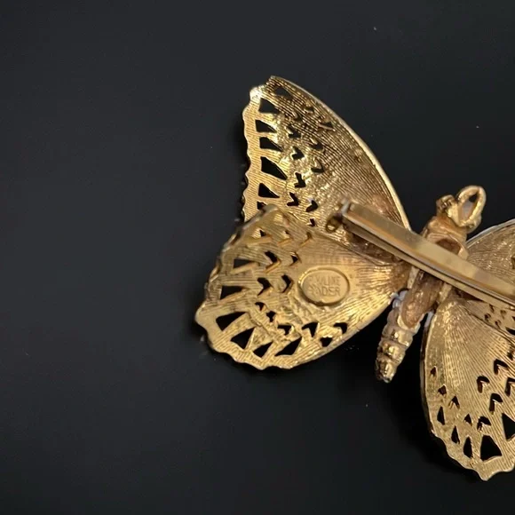 Gold toned & white enameled butterfly Exquisite craftsmanship Larger wings have springs underneath Usually described as a “trembling butterfly”Innovative and unique Designer: Pauline Rader Artist stamped Known for whimsical and largely animal & insect designs with Greek and Roman influences Sold in very limited quantities Sold through private commissions and a few boutiques In business 1962-1982Extremely rare and collectible piece!