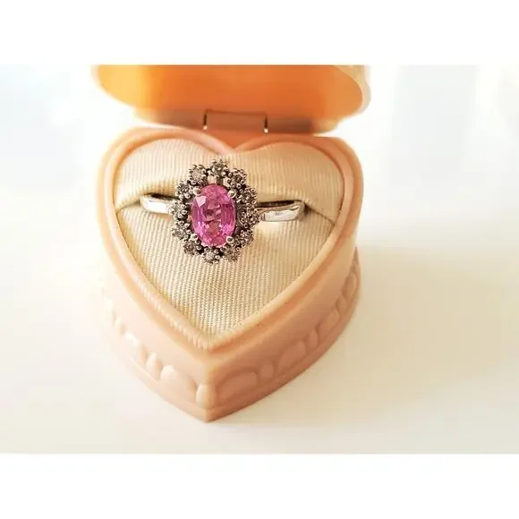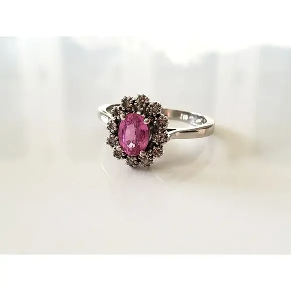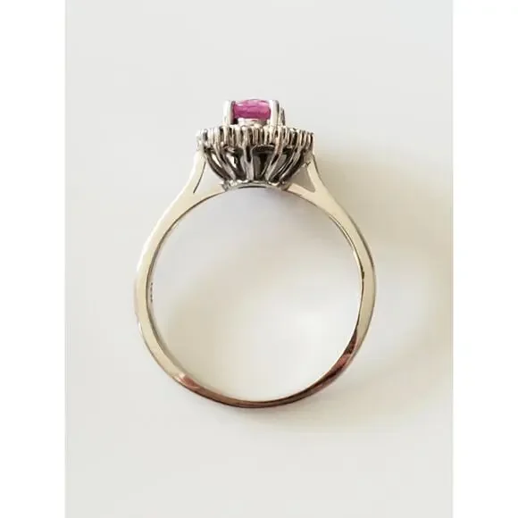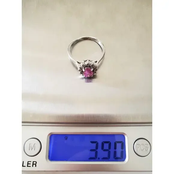 Please see all pictures as they are a part of the description.Excellent vintage condition!Specifics:Ring Sizes:8.8 (Resizable)Pink Stone (1, Oval):7mm x 5mmDiamonds (12,...