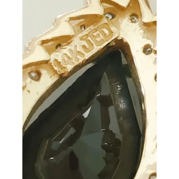 Please see all pictures as they are a part of the description.Excellent vintage condition!Specifics:Length:1 inWidth: 0.5 inWeight:3 gSapphire (1, Pear):13.5 mm x 10 mmDiamonds (18, Round):0.5 mm eachStamp(s):14K and Designer Hallmark of JED for E. DEMARCO, INC.*Vintage or Estate Jewelry typically exhibits signs of normal wear.Imperfections are a part of the unique character of each piece.Please view all pictures/details provided and feel free to reach out with additional questions.Boxes are for display purpose only.