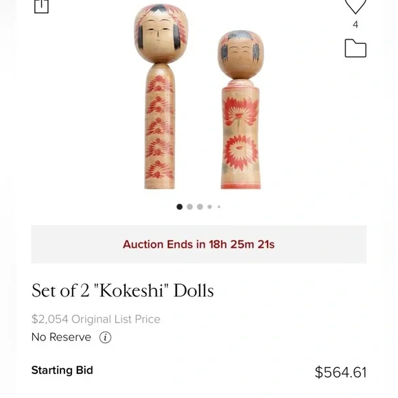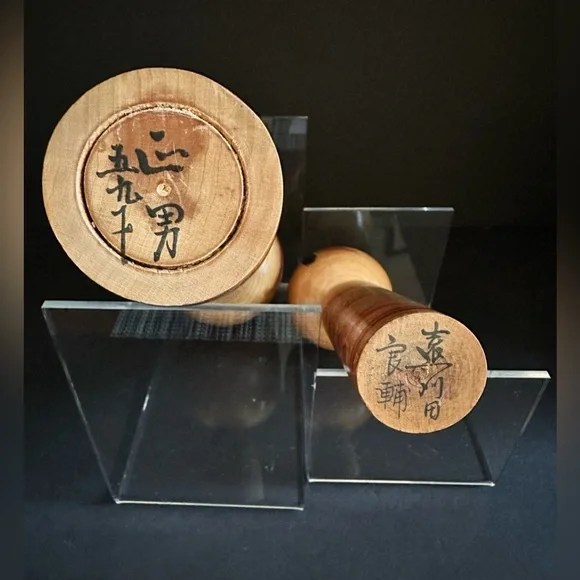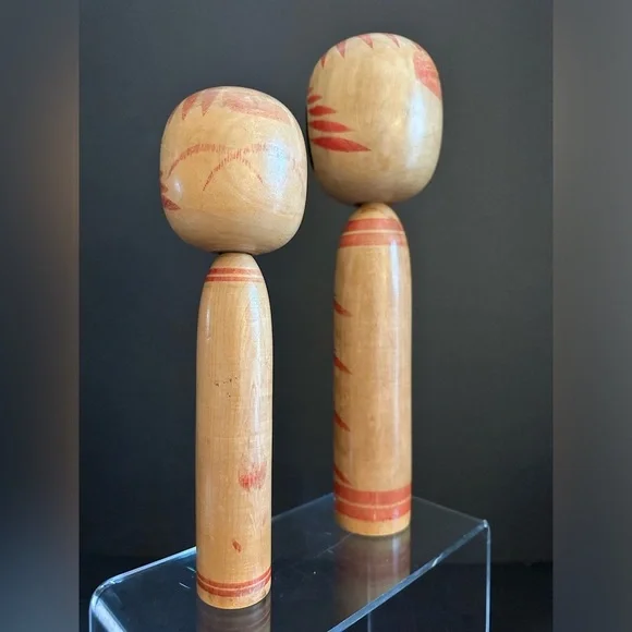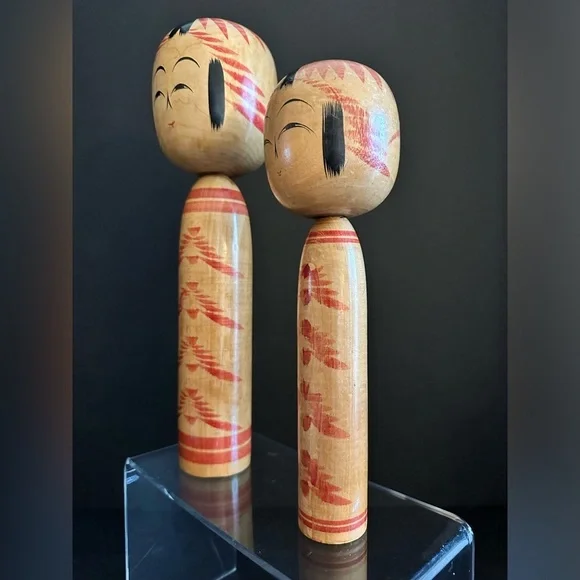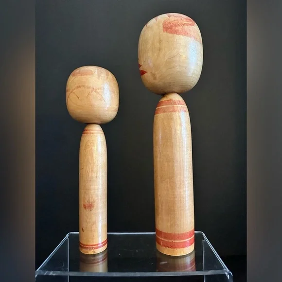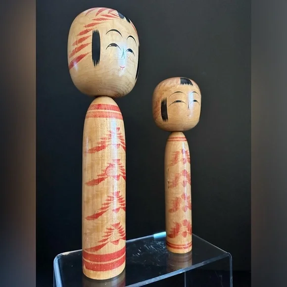 Vintage Japanese Large Kokeshi Doll Sasaku Creative Signed Ryusuke Saito A1It is the work of Ryusuke Saito, famous for traditional Japanese crafts. Ryusuke Saito was born in 1925 and specialized in Kokeshi until he died in 2015.It´s very impressive that the shape of the eyes and eyebrows match and the body is painted with autumn leaves. At the bottom is the author´s signature.This charming set features to vintage Kokeshi Deese, a traditional Japanese folk craft known for their simple, elegant designs. Both dollsare handcarved from wood showcasing, delicate craftsmanship with hand painted facial features and vibrant red patterns on their bodies. The larger doll stands approximately 12 inches. The smaller Doll stands 9 inches. These doubts are perfect for collectors of Japanese art or anyone looking to add a touch of culture to their home decor. Both dolls are an excellent vintage condition with minimal signs of Ware retaining the original paint finish.Currently on an active auction site with a starting bid of $564. See pic of the auction in photos