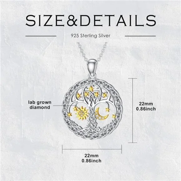 【Diamond Sun and Moon Tree of Life Necklace】the tree of life with both the moon and the sun symbolizes balance and wholeness. LWXIE stylish sun and moon tree of life necklaces with sparkling diamonds are an ideal gift for women.【Lab Grown Diamonds】our 0.03 cttw diamond sun and moon necklace uses lab grown diamonds which have the same visual and chemical components, making them identical to natural diamonds. in addition, they are more sustainable than natural diamonds due to lower emissions, resource usage and no excavations. Notably They Are Cruelty-free And Do Not Fund Wars.【Size and Material】pendant size: 0.87 inch*0.87 inch, chain length: 18 inch chains with 2 inch extender chains, diamond carat: 0.03 cttw. the chain, the pendant and the clasp are all made of S925 sterling silver, nickel-free, lead-free, cadmium-free and hypoallergenic, does not do any harm to your skin. we use only the best materials to let our customers be rest assured.【Gifts】 will be packaged in an elegant gift box and delivered to our customers. diamonds are a woman´s best friend, our diamond tree of life sun and moon necklace is a perfect gift to show love to mom, wife, daughter, girlfriend, sister or friend. great choices for Mother´s Day, Thanksgiving Day, Valentine´s Day, Birthday, Christmas etc.