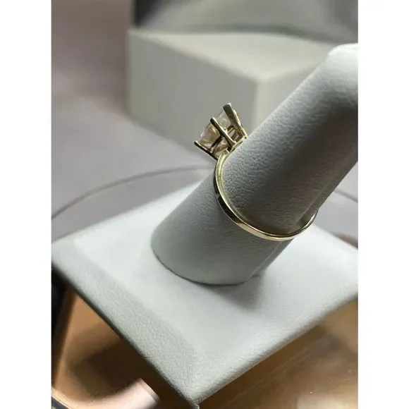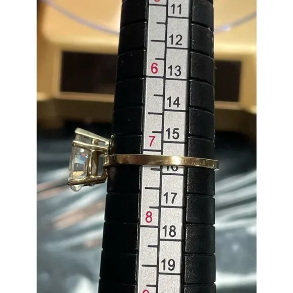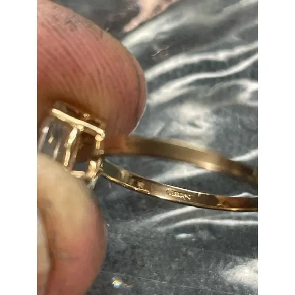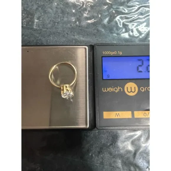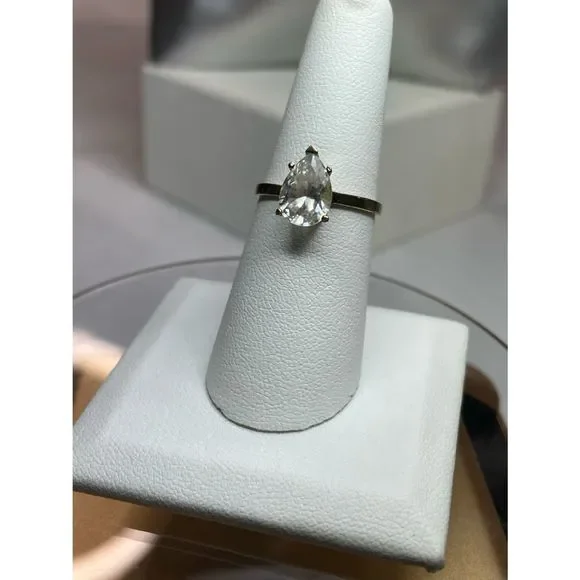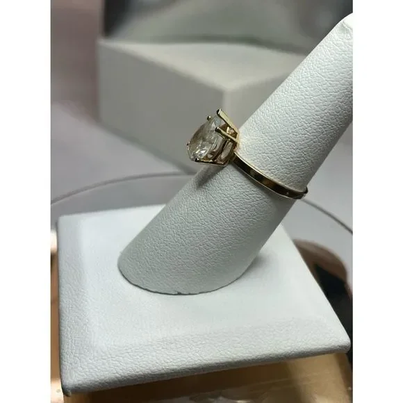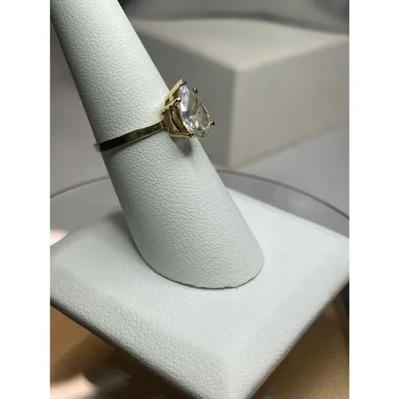 Here we have a 14k yellow gold pear CZ Diamond solitaire ring. Weight is 2.2 grams. Size is approx 7.25. Cz carat size is 1.71 carats. We have attached an xrf gold scan to show the karat of the gold since the stamp is so hard to read.