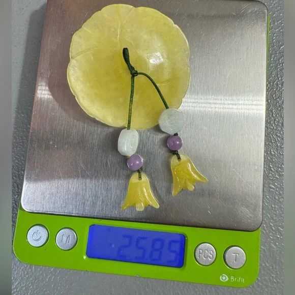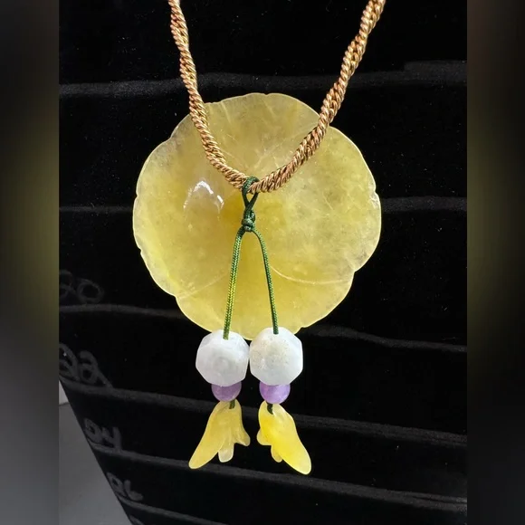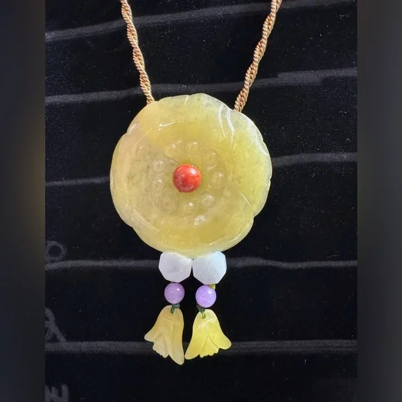 Chain: vermeil gold over 925 Sterling silver twisted link chain 17.5” long x 3.4mm wide and thick Lobster clasp and stamped 925 with maker’s markPendant: flower carved yellow, green & purple jade large pendant There is a red carnelian bead in the center of the flower. Approx. 8.3mm round carnelian beadApprox. 3.5” long including danglesApprox. 2” wide x 5.5mm thickIn excellent condition.Please inspect each pic for those are important part of product description. Thank you for stopping by.