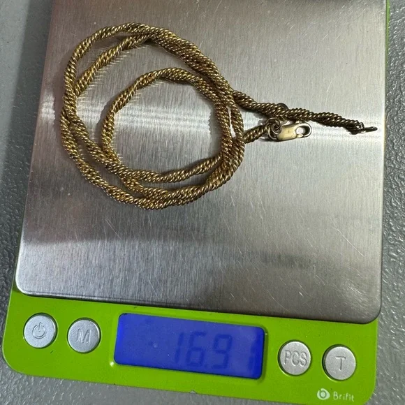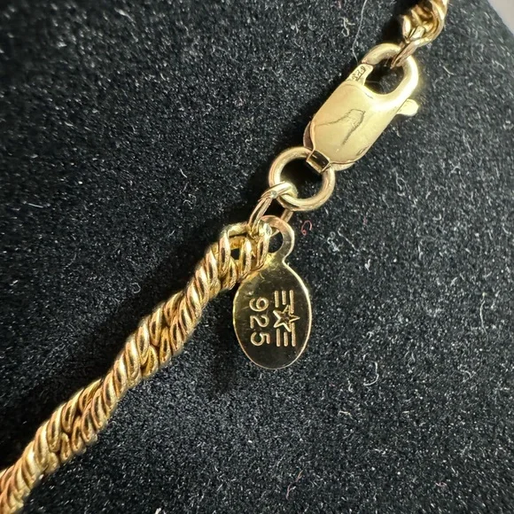 Chain: vermeil gold over 925 Sterling silver twisted link chain 17.5” long x 3.4mm wide and thick Lobster clasp and stamped 925 with maker’s markPendant: flower carved yellow,...