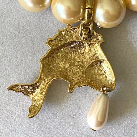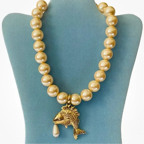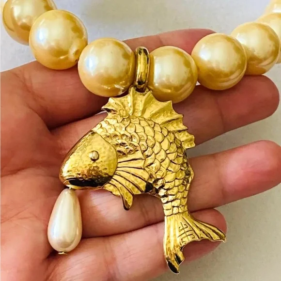RARE Vintage 90s GIVENCHY Chunky Faux Pearl KOI FISH Pendant STATEMENT NECKLACE