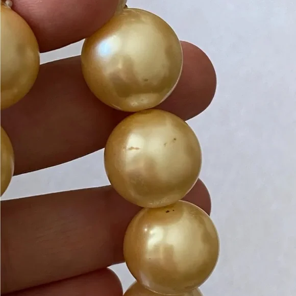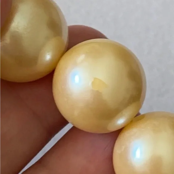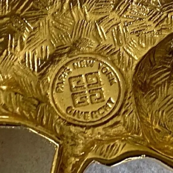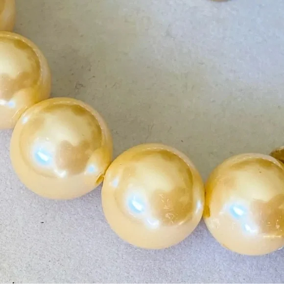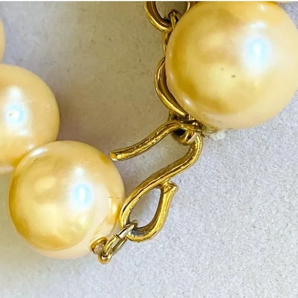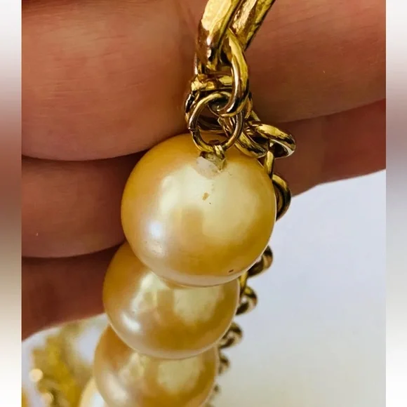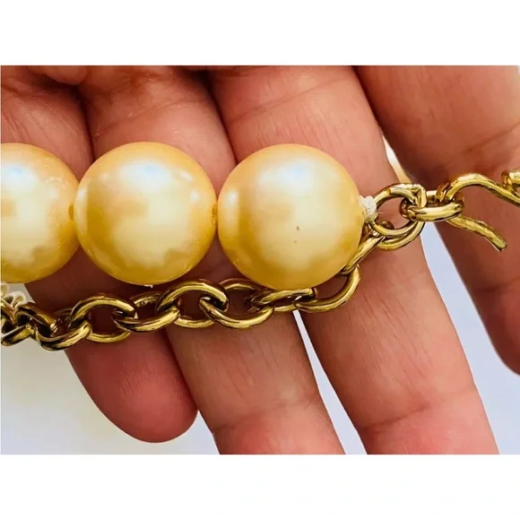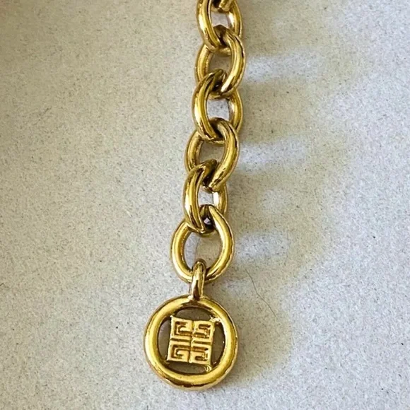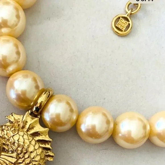 Extremely scarce vintage circa 1990´s chunky Givenchy fish pendant and faux pearls necklace. Makes a statement! Gold tone with faux pearls. Adjustable from approx. 18" to 21 3/4". Measures approx. 2 1/8" by 1.5" across widest points of fish pendant. Each chunky faux pearl is about 11/16" wide. In wearable condition, but if you look closely you will see some small spots on the faux pearls and at least one has some of the coating chipped off, as shown in the close up pictures. Expect signs of age and previous use.