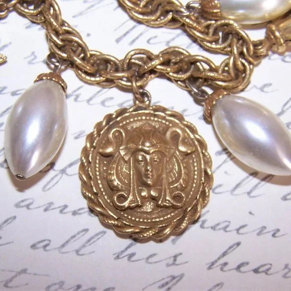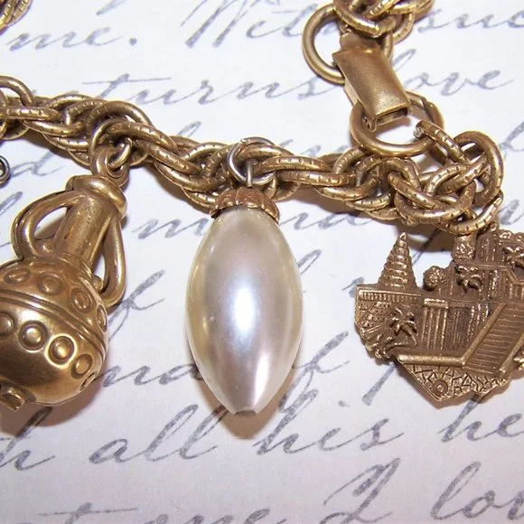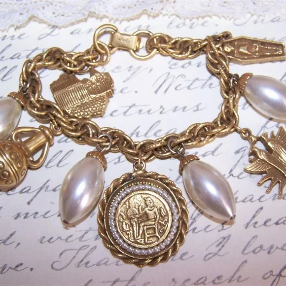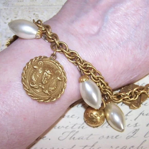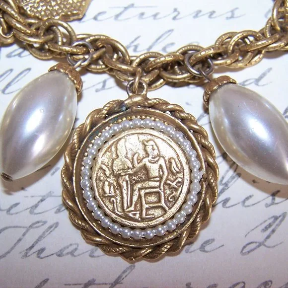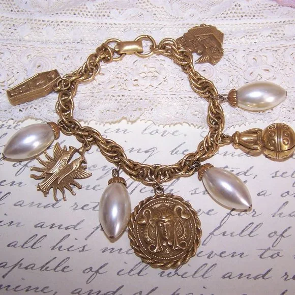 RARE 1960s Coro Egyptian Revival Charm Bracelet with 5 Pharaoh Charms & 4 Pearls