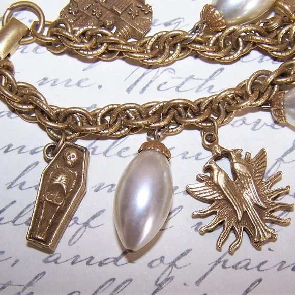 Dating to the 1960s or so, the time when big and bold charm bracelets were all the rage, may I offer this antiqued gold tone metal charm bracelet by CORO holding 4 elongated glass pearl beads (about 1" long) and 5 Egyptian charms - Pharaoh´s Palace, Wine Jug/Urn, Double Bird, Open Coffin with Skeleton and the piece de resistence - a double sided center round with an Egyptian Pharaoh Head shouldered by two snakes on one side and a pearl bordered Seated Pharaoh with Servant on the other (about 1-1/8" long). Fold over clasp closure bearing the CORO hallmark. Length of the bracelet is 7-1/2" wearable; width of the chain is 1/4". When worn, the bracelet does have a CLANK when the charms/beads bump each other. The bracelet is in excellent condition with no problems I can spot - everything is almost "as new" with no discoloration anywhere. So well made and so RARE! In checking the Internet, I could not find this exact piece anywhere - I found lookalikes with HIGH price tags but never this exact same bracelet. So I rather think that in terms of Egyptian Jewelry from CORO, I have found the holy grail. In checking the Internet, I see a similar (not an exact duplication) for $795, another similar for $1,000CDN and another similar for $895. I think I can save Buyer some $$$$