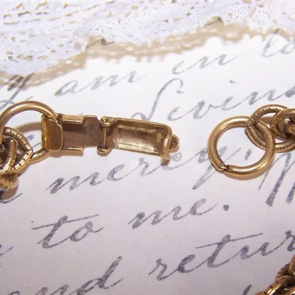Dating to the 1960s or so, the time when big and bold charm bracelets were all the rage, may I offer this antiqued gold tone metal charm bracelet by CORO holding 4 elongated glass...