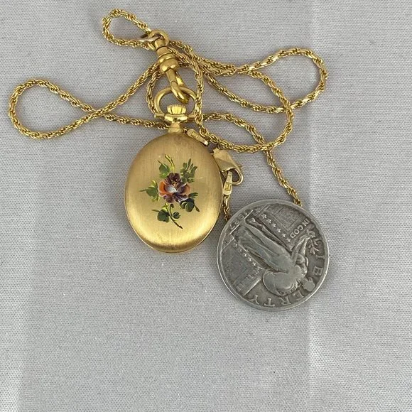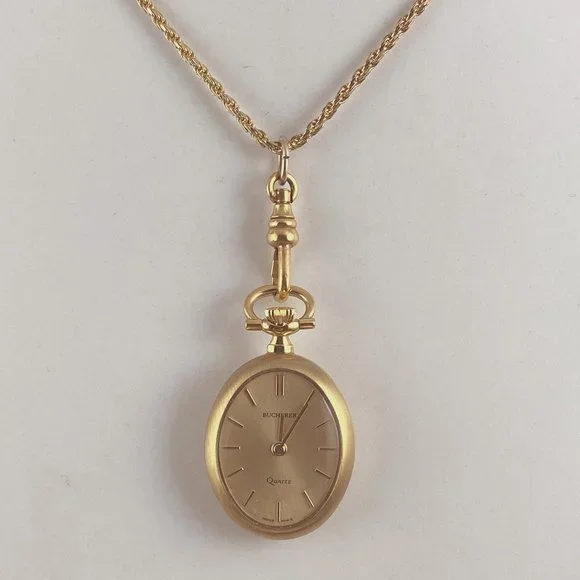 Vintage Fabulous Swiss Made Bucherer Pendant Watch 1.5x0.75 inch inch Oval Case Beautiful Pansy Flower pattern on reverse Mineral CrystalPansy Flower has Orange and Purple Color with Green Leaves and stemsON FACE OF WATCH IT READS " Bucherer Quartz Swiss Made" in excellent condition runs and keeps time has a Swiss movement This watch comes with a Italian 925 Silver Necklace with 22K gold Platting (vermeil)24 inch Gold Filled chainBEAUTIFUL PIECE IN EXCELLENT CONDITIONErnst and Carl Eduard Bucherer, joined the family-owned company in the 1920s and, thanks to their wide-ranging experience, took it even greater success. In 1924, Ernst Bucherer entered into a particularly fruitful partnership with Hans Wilsdorf, the founder of Rolex. He decided to include the then little-known watch brand in its range. Today, Rolex is one of the world´s most celebrated watch brands and remains the House of Bucherer´s most important partner.