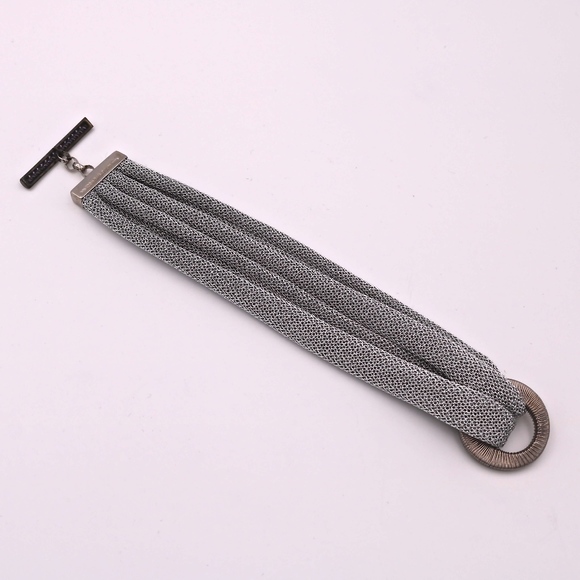 Adami & Martucci Soft Silver Mesh Multi-String Bracelet has a modern and unique design. It comes with a circle silver wired buckle on one side and with a toggle clasp bar with purple cubic zirconia on another side. Brand name: Adami & Martucci (engraved on the side of rhodium-plated metal)Style number: B2M41BP7BWMetal: rhodium-plated .925 sterling silverSize: approx. 2" W x 7" L Buckle size: 1 1/8"Closure: toggle claspStyled in Italy. Made in Bali, Indonesia.