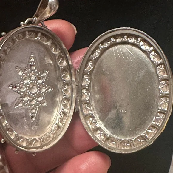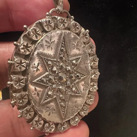 This antique Victorian oval locket, crafted from sterling silver and dated Birmingham 1889, features a striking star design. Measuring 2 3/8 inches, this locket is most likely used as a mourning piece, reflecting the sentimental practices of the era. While there are three very minor pinholes on three of the beads on the face of the locket, there is no structural damage considering the age of this piece. Its elegant shape and intricate detailing offer a glimpse into the craftsmanship of the Victorian period, making it a meaningful addition to any jewelry collection.- Item: Antique Victorian oval locket- Material: Sterling silver- Design: Star motif- Origin:Birmingham, 1889- Size: 2 3/8 inches- Purpose: Most likely used as a mourning piece- Condition: Consistent with the age of this piece -Three very minor pinholes on three beads, no structural damage- Significance: Reflects Victorian-era sentimentality and craftsmanship