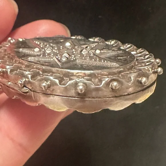 This antique Victorian oval locket, crafted from sterling silver and dated Birmingham 1889, features a striking star design. Measuring 2 3/8 inches, this locket is most likely...