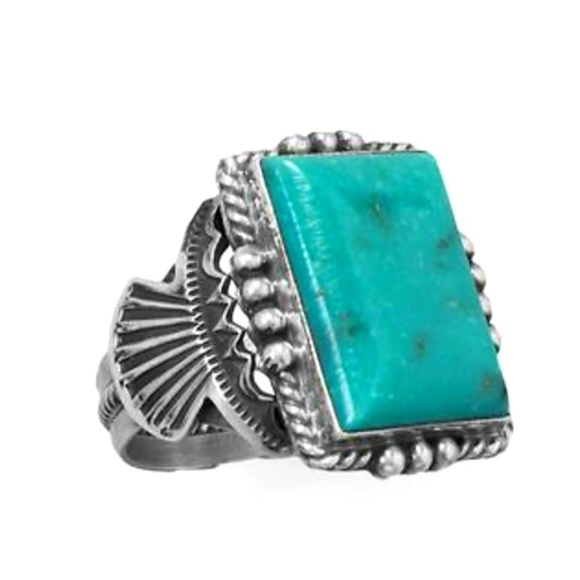 Bold Navajo turquoise ring! This outstanding men´s statement ring is designed and hand crafted by Navajo silversmith Michael Calladitto. Each ring has an "M&R Calladitto Navajo" stamp to show its authenticity. Rectangle stabilized Kingman turquoise measures 14.5mm x 20.5mm. Michael hand selects each stone for every ring he crafts, colors and matrix will widely range, please allow for variances. 925 Sterling Silver.PRICE IS FINAL! ALREADY DISCOUNTED. NO OFFER NO TRADE NO RETURN OR EXCHANGE.
