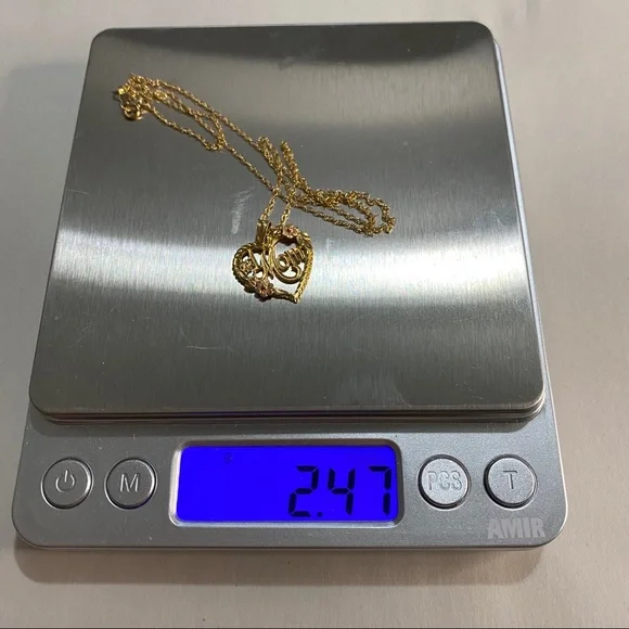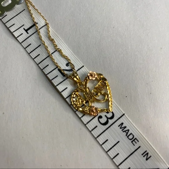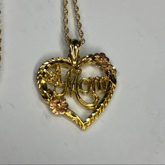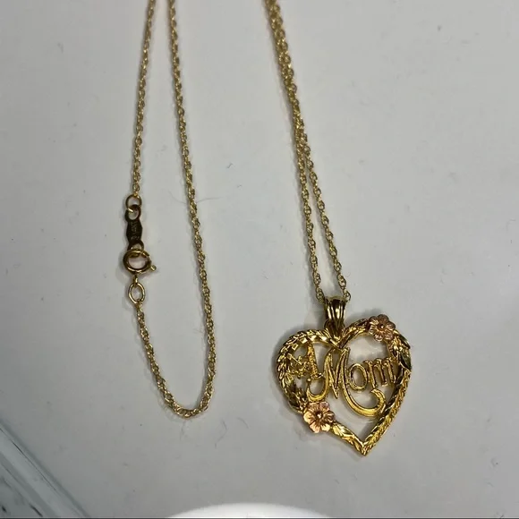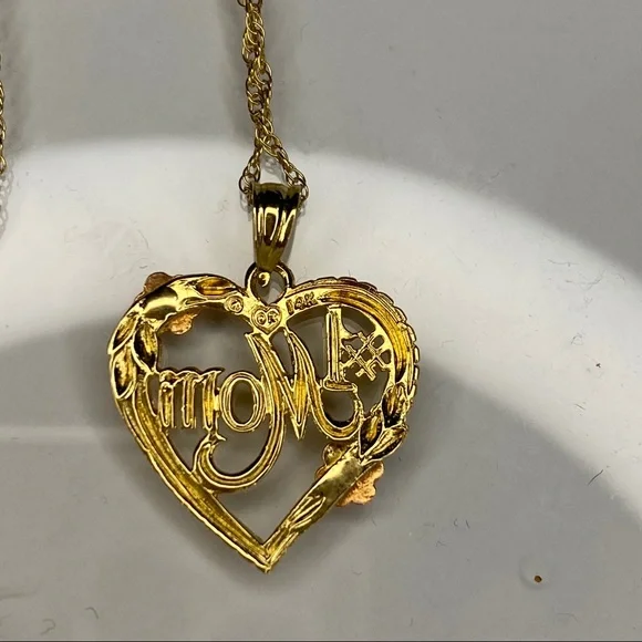 14K Yellow + Rose Gold #1 Mom Necklace. Beautiful heart shaped pendant necklace #1 Mom with rose gold colored flowers. Both pendant and chain are marked 14K. Would make a great...