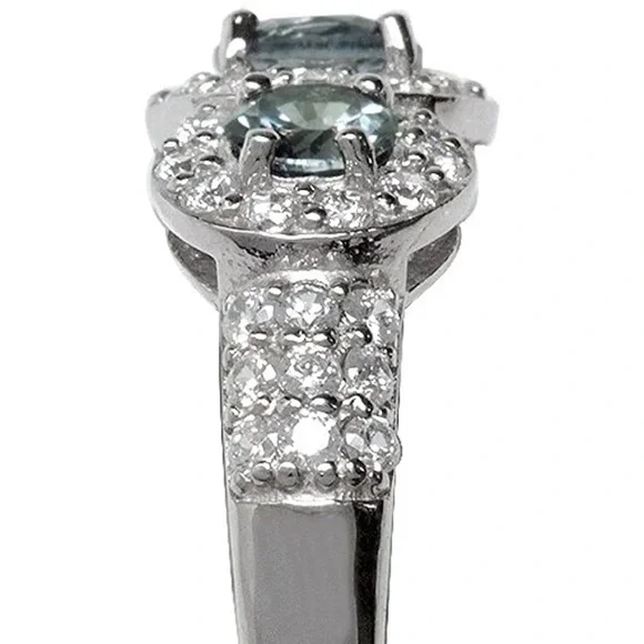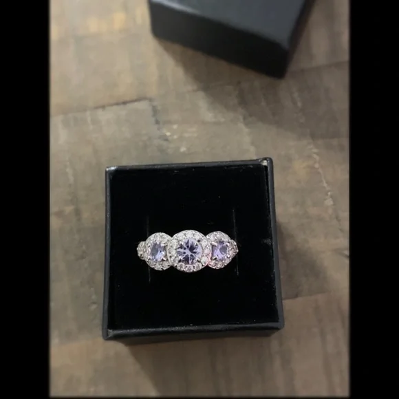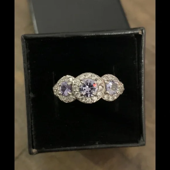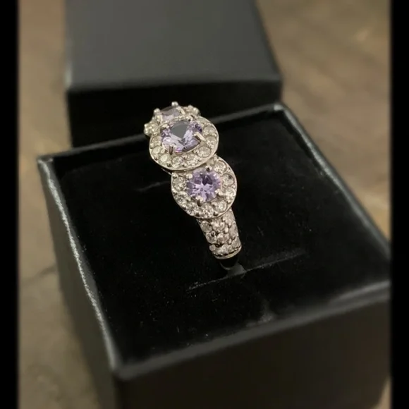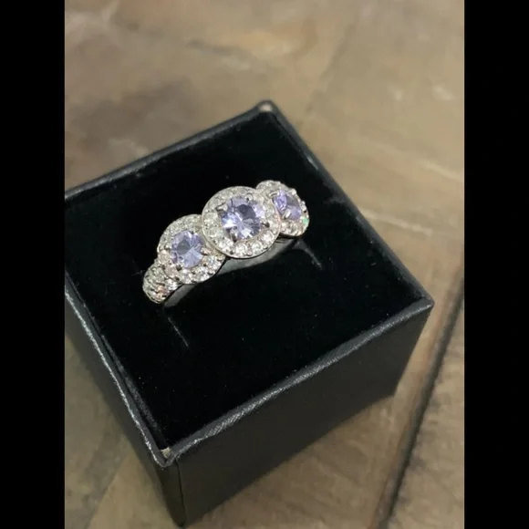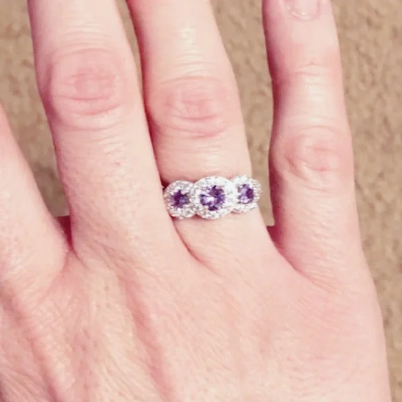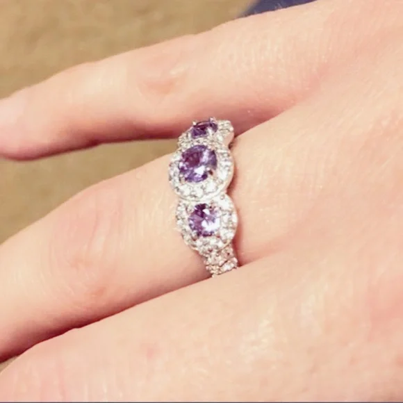Gorgeous Alexandrite color changing ring in a three stone setting surrounded by sparkling white topaz. The color hues are breathtaking in different lighting. An Alexandrite gemstone grown with all the physical properties of a mined Alexandrite. NWOT* VS1-VS2 Color Changing Alexandrite * 1.84 Carats* Sparkling Pinks and Greens Alexandrite* White Topaz sparkles like diamonds* White Gold and Fine 925 Sterling Silver