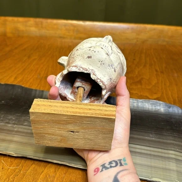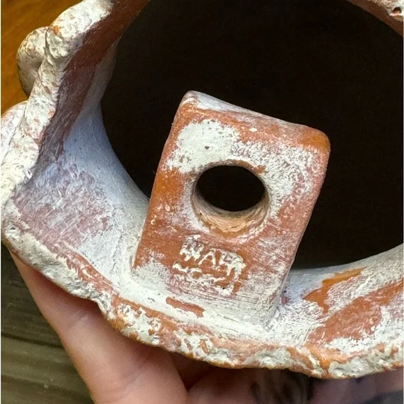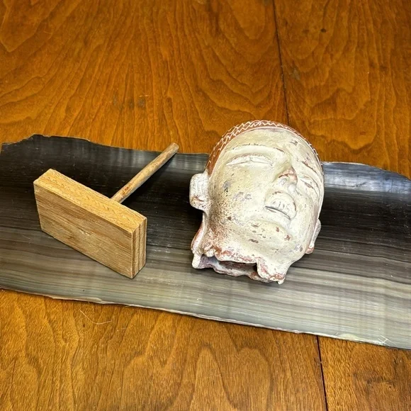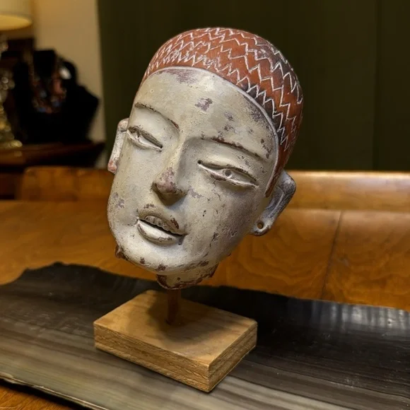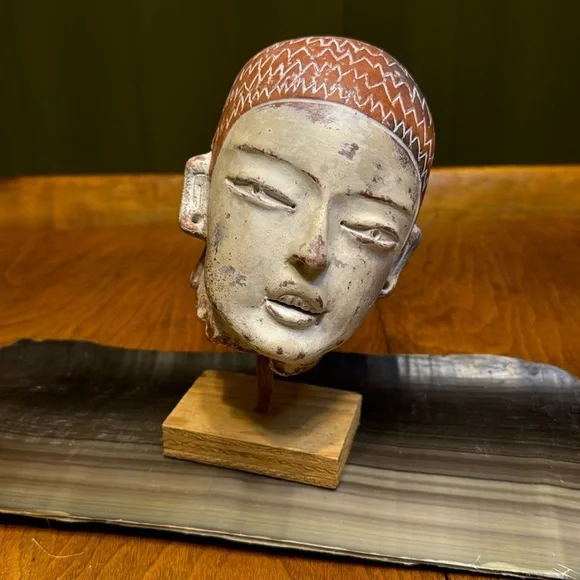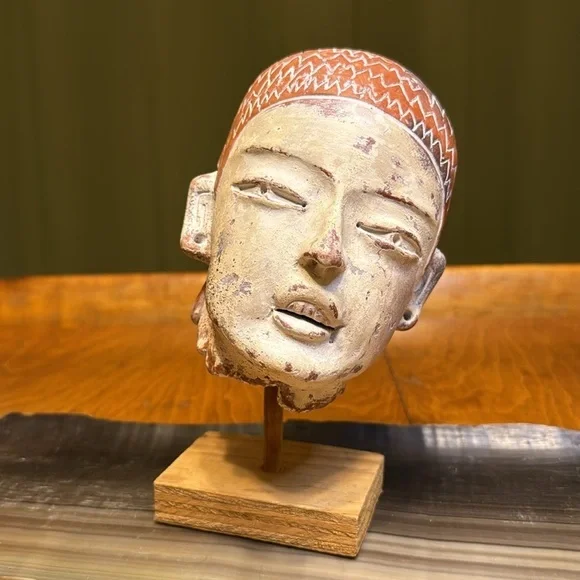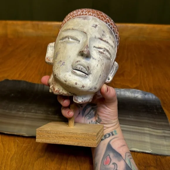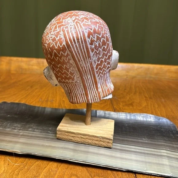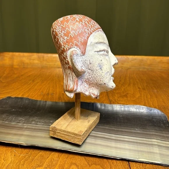 Vintage terracotta Aztec Mexican head sculpture INAH MEXBeautiful terracotta hand sculpted figurative head. Signed INAH MEXICO. Reproduction licensed under the National Institute of Anthropology and History in Mexico. Beautiful sculpted piece in the style of pre-columbian Aztec antiquity. Comes with a lovely simple wood base for display. Measurements Height: 6 inchesWidth: 5 inches Depth: 5 inches