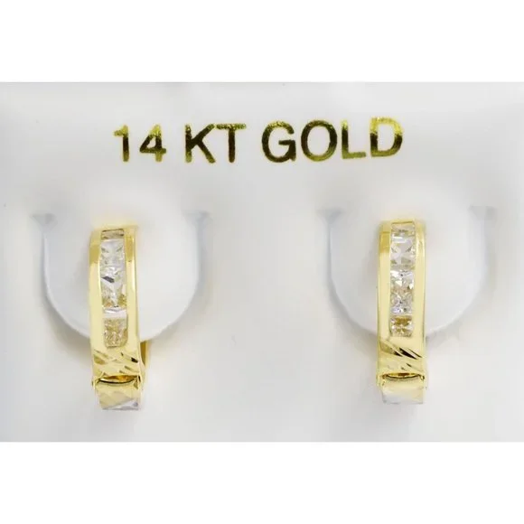 Metal purity: 14k Yellow GoldCondition: New with tagGemstone Type:8 Created White sapphiresTotal ct weight :1.28 caratsWhite sapphire grades:Hue . . . whiteSaturation. . . vividCut . . . excellentNo inclusions or flawsDimensions: 3 mm earrings width 13 mm (0.51") diameter