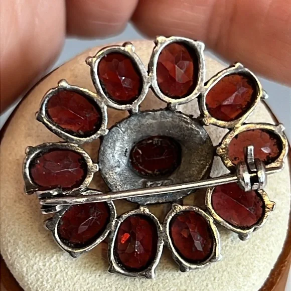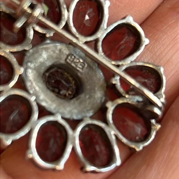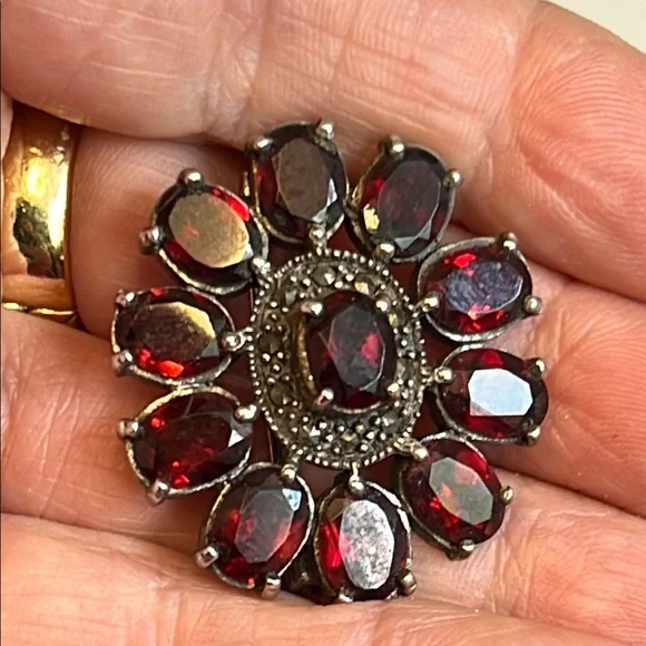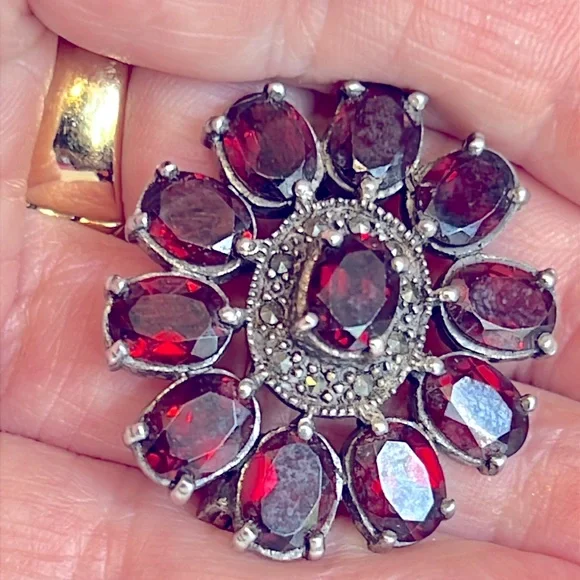 Sterling silver and Garnet brooch features deep red gemstones set in a classic design. Perfect for adding a touch of elegance to any outfit. About 1 1/4 inches