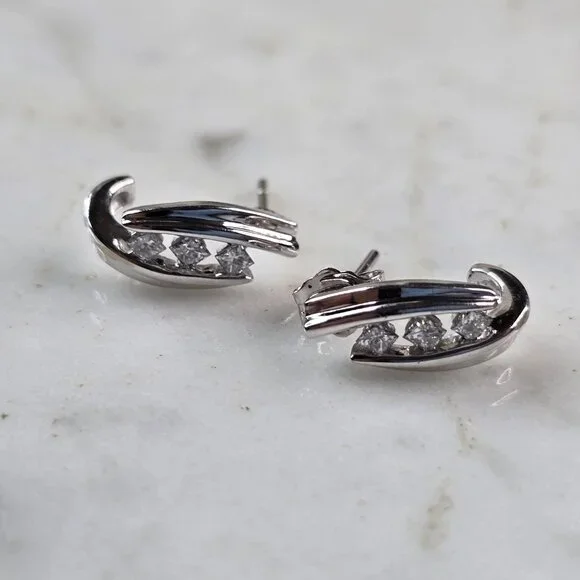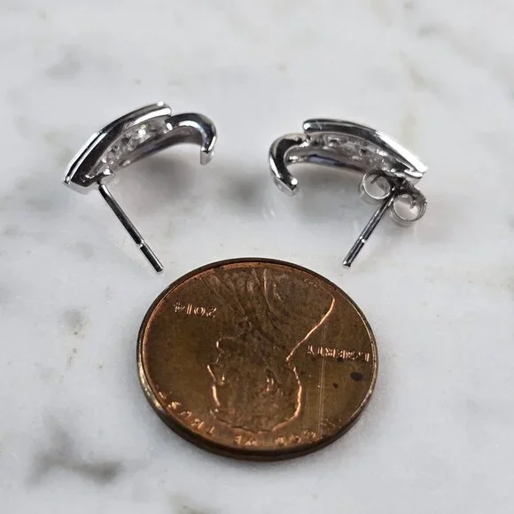 ALOVELY PAIR OF WOMENS 10K WHITE GOLD DIAMOND EARRINGS.THE EARRINGS WEIGH 2.1g, AND MEASURE 1/2" BY 1/4".THERE ARE ABOUT 0.12cts OF DIAMONDS TOTAL.ONE EARRING IS MISSING A BACKING.ANY QUESTIONS, PLEASE DON´T HESITATE TO ASK.BE SURE TO CHECK OUT SOME OF MY OTHER OTHER GREAT ITEMS UP FOR SALE.THANK YOU.