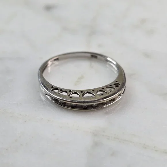 A WOMENS VINTAGE ESTATE 10K WHITE GOLD DIAMOND RING. THE RING SIZE IS A 7.0, AND WEIGHS 2.1g.THE RING IS 1/8" WIDE. THERE ARE 8 TINY DIAMONDS IN THIS RING.RING IS MARKED ON THE INSIDE OF THE BAND.ANYQUESTIONS PLEASE DONT HESITATE TO ASK.BE SURE TO CHECK OUT SOME OF MY OTHER GREAT ITEMS UP FOR SALE. THANK YOU
