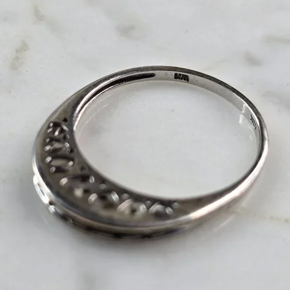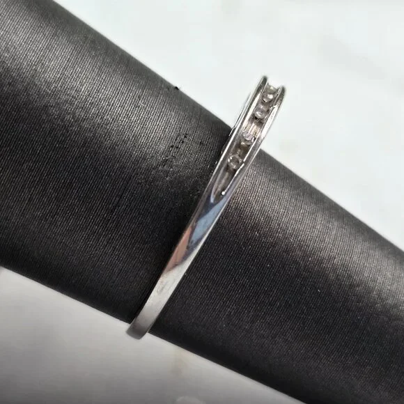 A WOMENS VINTAGE ESTATE 10K WHITE GOLD DIAMOND RING. THE RING SIZE IS A 7.0, AND WEIGHS 2.1g.THE RING IS 1/8" WIDE. THERE ARE 8 TINY DIAMONDS IN THIS RING.RING IS MARKED ON THE...