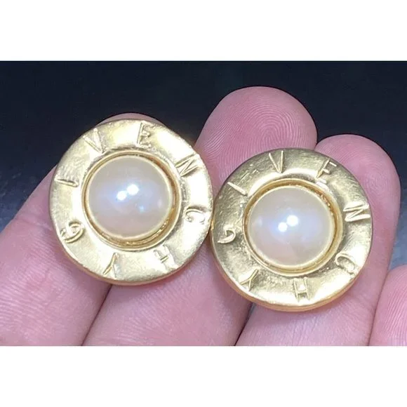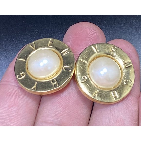 Givenchy Signed Gold Plate Pearl Earrings Round Clip On Paris NY