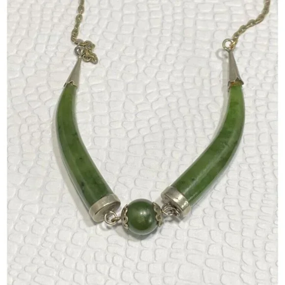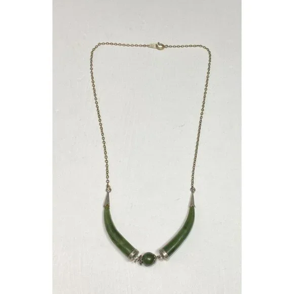 Vintage 925 Double Horn Green Jade Gold Tone Necklace 17 inches.The necklace is in good vintage condition light wear due to age and use. Measures 17 inches long. Jade pendant...