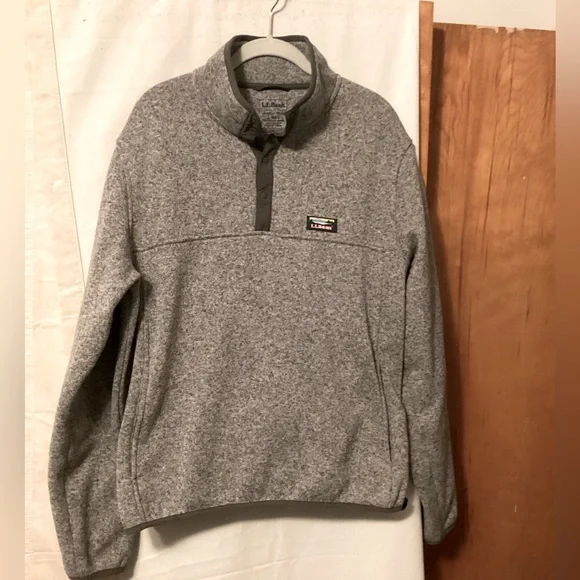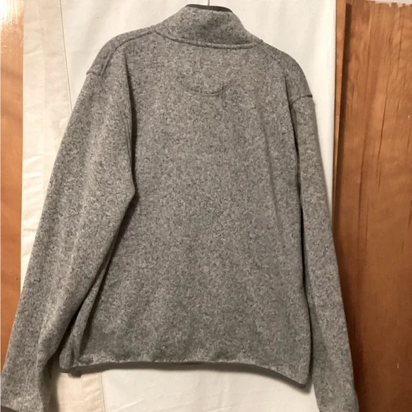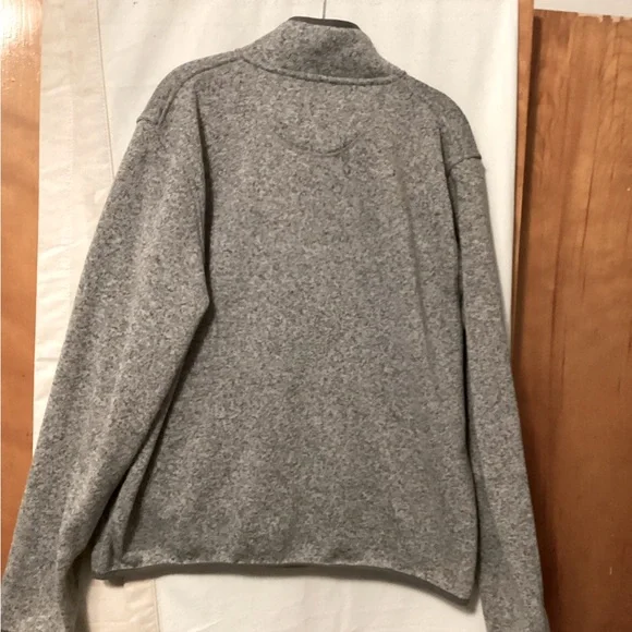 Gray 100% polyester slightly fitted jacket Over head with 4 snap closure Dark gray piping at neck,hem and cuff Length 26” pit to pit 24” approx Preowned but in good condition # fall # transition piece # outdoor activity # work