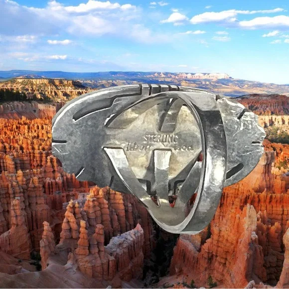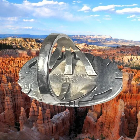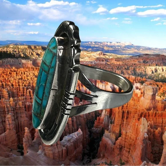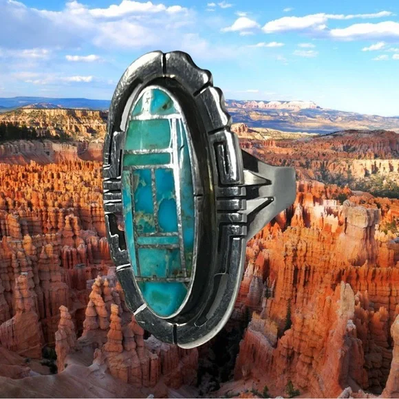 Created by award winning, Navajo artist Gilbert Nelson. He is a master of inlaid, native jewelry and uses only the best material for his work. This elongated ring is 1 3/8 inches...