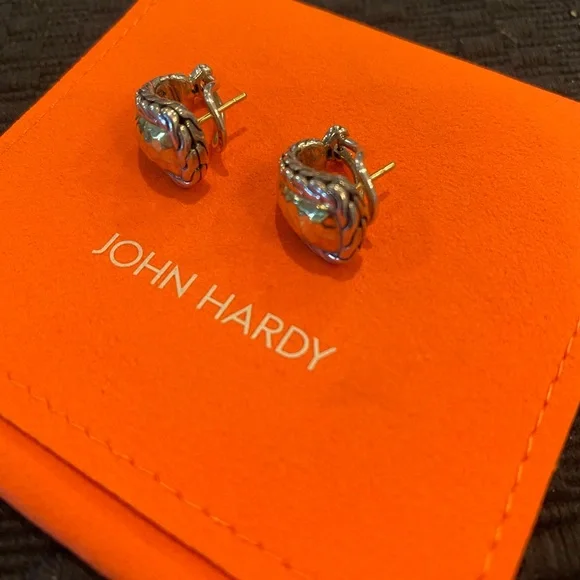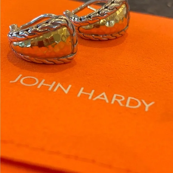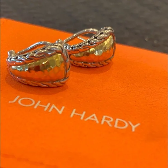 These are a pair of classic John Hardy Palu earrings with the center hammered in 24 Karat Gold The boarder is the traditional chain design. The earrings have omega clips for...
