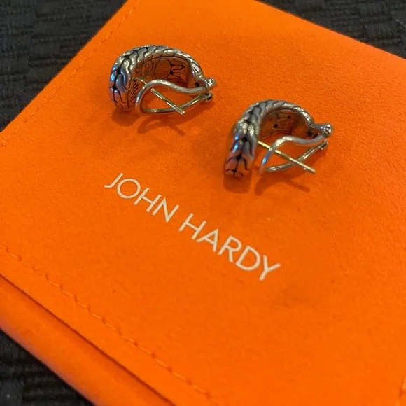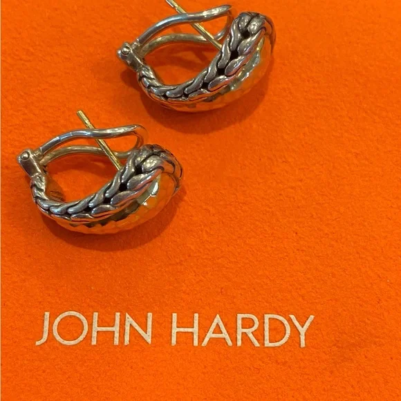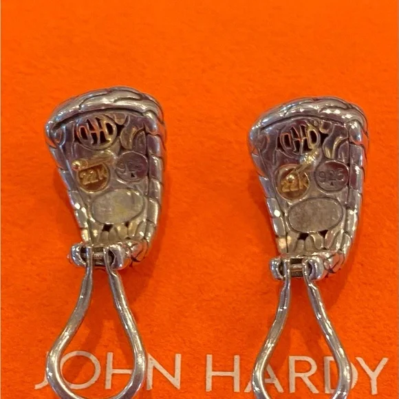 These are a pair of classic John Hardy Palu earrings with the center hammered in 24 Karat Gold The boarder is the traditional chain design. The earrings have omega clips for pierced ears. This closure insures the earring stay close to the ear. Perfect. A great everyday earring with class. In excellent condition Pouch as shown includedA great price at $295