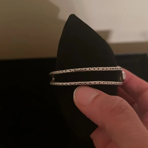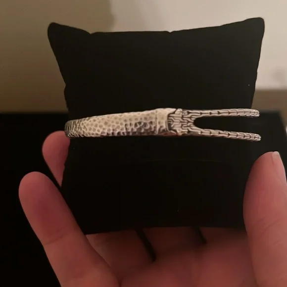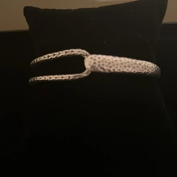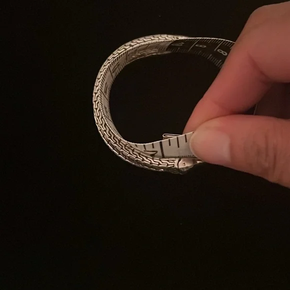 This bracelet is handmade in Bali using 360 degrees of exterior and interior design elements. The exterior has two finishes: chain link and hammered. The interior is gracefully finished with three sections of chain link sterling silver. This oval bracelet comfortably fits up to a 7” wrist. The bracelet opens and closes with a retention hinge for a secure fit. Handcrafted in Bali by local artisans, this preloved bracelet is designed by Artisan of Bali.