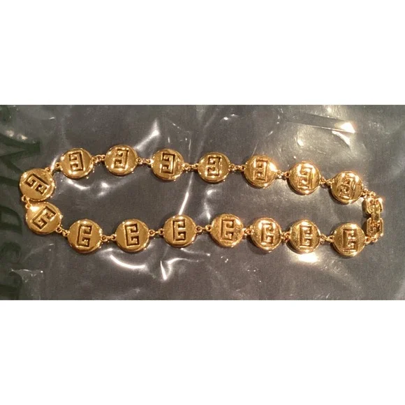 A striking Givenchy necklace featuring a series of circular medallions, each adorned with the iconic Givenchy logo. The necklace is designed with a classic chain link construction, connecting each medallion seamlessly. The gold tone finish adds a touch of luxury and sophistication to the piece, making it a standout accessory.The lighting doesn´t doesn´t do it justice. This is a pretty bright gold!Style: Chain, StatementType: NecklaceColor: GoldPendant Shape: RoundMetal: Yellow Gold PlatedMeasures 15" longMain Stone Shape: RoundCountry of Origin: FranceI pride myself on 100% positive feedback. Please contact me with any issues before leaving negative feedback. I will resolve as needed. Comes from smoke free home.