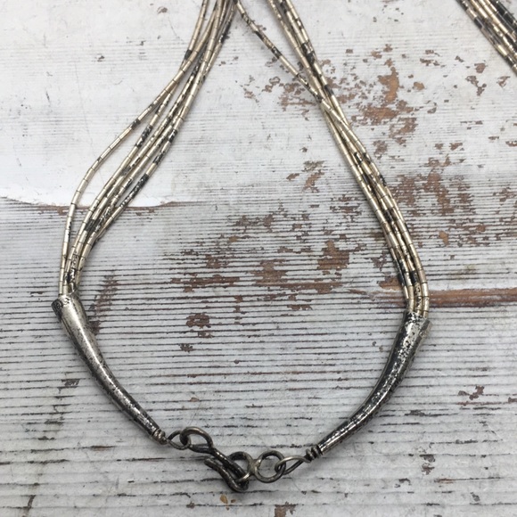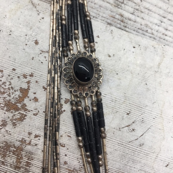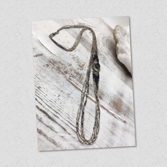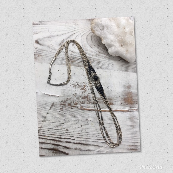 Stunning Vintage Navajo Sterling Silver Liquid Multi Strand with Large Onyx Pendant and Onyx Barrel Beads will become an heirloom piece in your jewelry wardrobe or gift to someone precious in your life.A unique piece that Pendant and Beads are on the side giving it a gorgeous look.Measures 26”, weighs 16 grams.It has a beautiful patina, I do not clean vintage pieces, included cleaning cloth for personal preference.Let me know if you have any questions.Have a FABULOUS day!Linda