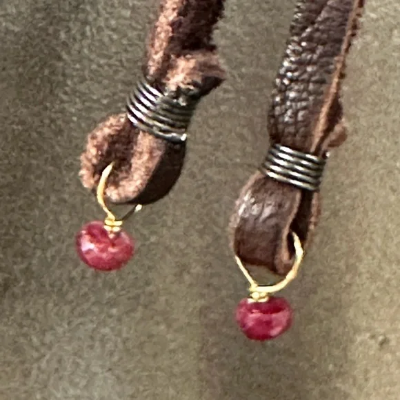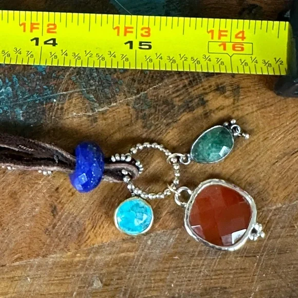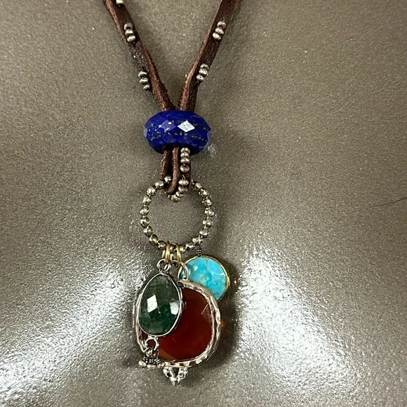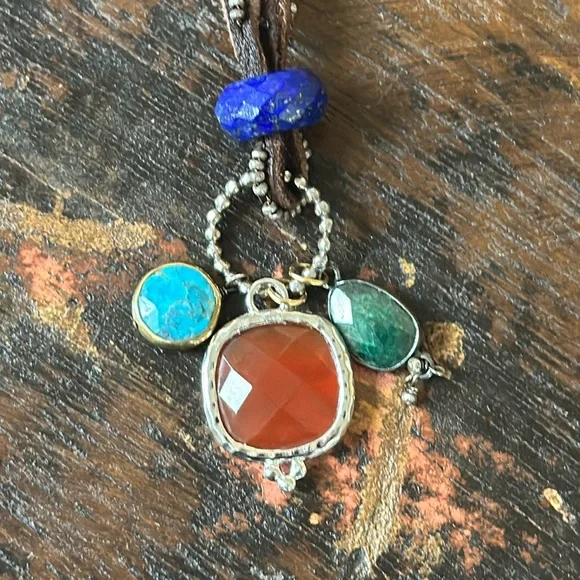 “Bubbling Up” adjustable leather cord necklace with orange carnelian labradorite, turquoise, emerald, lapis and sterling silver as main focal points and tiny ruby dangles on the ties. New in box from Sundance.