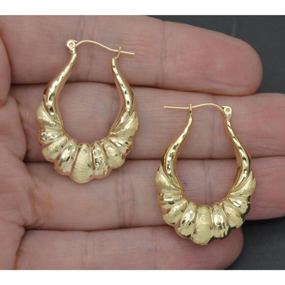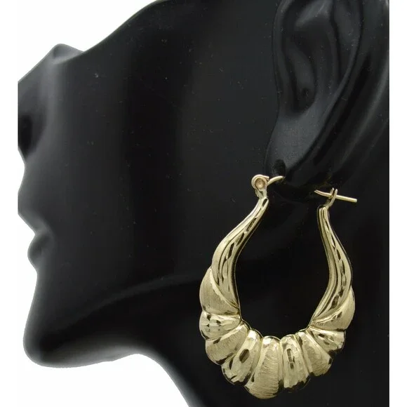 Say hello to your new favorite earrings; these stylish Real 10K Solid Yellow Gold 30mm Shrimp Puffed Diamond Cut Hoop Earrings are sure to brighten up any outfit. Showcasing a unique shrimp puff design and diamond cut finish, they sparkle and catch the light with every move. Feel confident in the durable quality of 10K gold, and enjoy the light weight of the 2.9-gram earrings all day long. Wear these hoops and feel luxurious and stylish whatever the occasion. Specifications:Metal: Real 10K Yellow Gold (Stamped, 10K)Condition: Brand NewPolished: ShinyWeight: 2.9 gramsWidth: 30mmMetal DetailsType - 10k solid gold