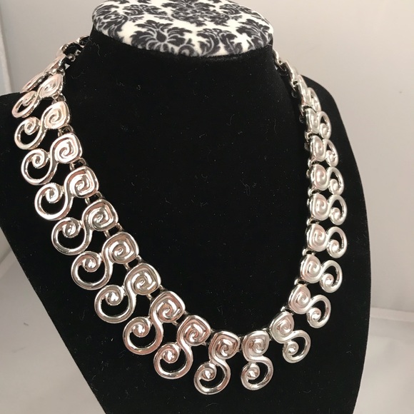 Gorgeous heavy silver color necklace from Ann Klein IIVintage chunky necklace Swirly S shaped sideways links create this whimsical necklace Very shiny - eye catching Toggle...