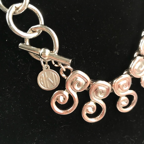 Gorgeous heavy silver color necklace from Ann Klein IIVintage chunky necklace Swirly S shaped sideways links create this whimsical necklace Very shiny - eye catching Toggle closure with silver disc embossed with AKIIMS1021513