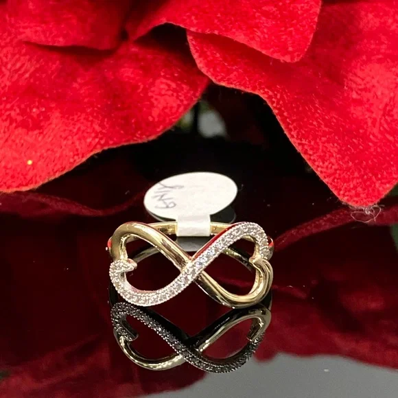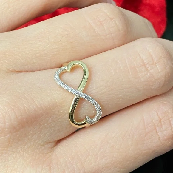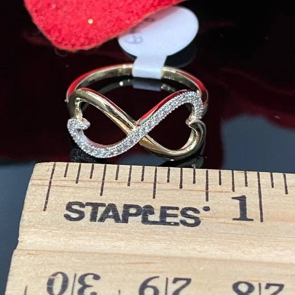 Style: Ring Stone: Cubic ZirconiaInfinity Size: 18.3mm x 9.7mm approx. Ring Size: US 6.5Metal: 14K Yellow Gold. NOT GOLD PLATED NO TRADE!! Photos are enlarged to show detail Please refer to photos with measurements for the size