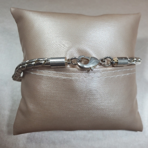 Nwot approximately 17 grams of silver in a rope design with a lobster claw clasp make up this beautiful every day bracelet. Tough yet elegant. Awesome gift or wear it with anything. Thank you for visiting my closet and please bundle follow me to see what´s coming next. Again thank you. God bless
